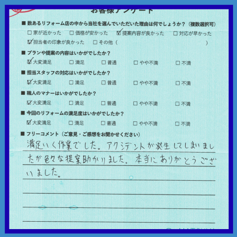 細かい所までお気遣い頂き大変満足なリフォームとなりました。